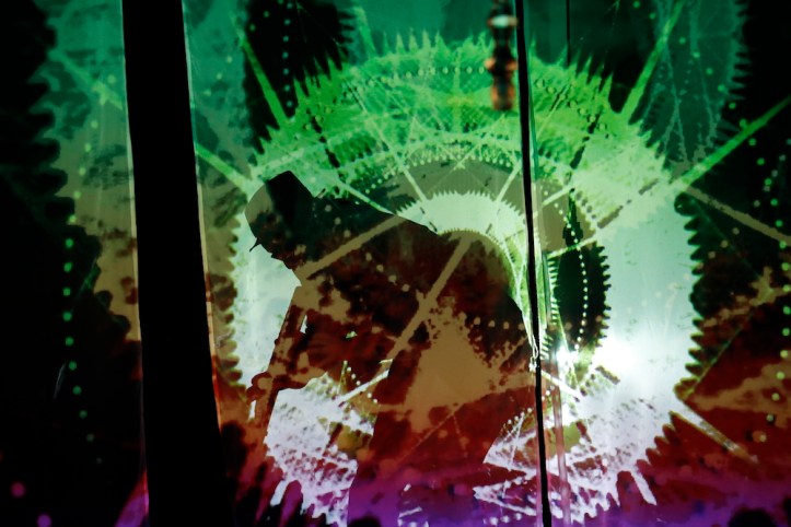 ステージの前には薄暗い劇場は、たくさんの観客でうまっていた。透きとおる白いカーテンが観客に覆いかぶさるようにかけてあった。何に使うのかと思っていたら、ショーが始まると、そこにさまざまな画像が映し出された。