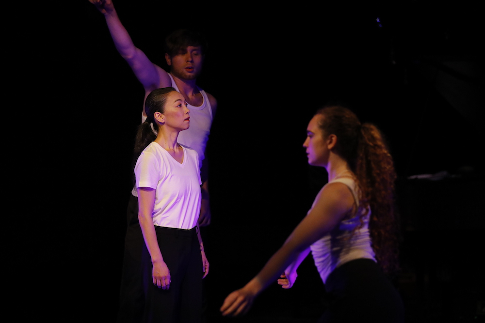 白人男性、白人女性、黒人女性の3人の若いダンサーたちの迫力あるダンスは線が太くて現実味がある。彼らの中心に立ってゆっくりと回っているだけの折原なのだが、空気のように軽やかでまるで妖精のようだ。その3人の若い肉体が突然折原にぶつかってきて、折原は怯える。