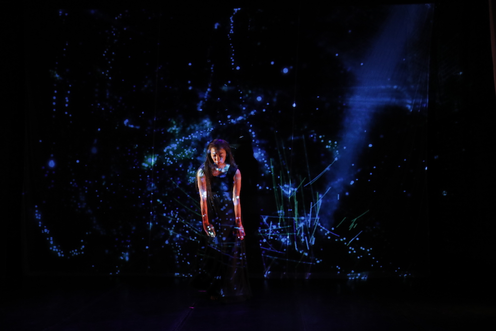 白いドレスを着た流れるようなダンスに光をあて、氷ばかりに囲まれた世界のような幻想的な視覚効果を与えられる。まるで鶴の恩返しの現代版のよう。鳥のように舞う折原が、空へ飛んでいって消えてしまいそうなほどに美しい。