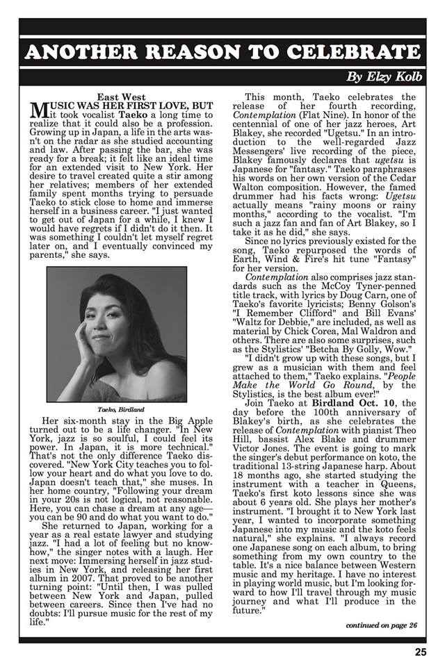 アメリカ東海岸のジャズクラブでは必ず入り口に置いてあって、ジャズファンは誰しも手にする著名なフリー雑誌「ホット・ハウス・ジャズ・マガジン」の今月号に全面でインタビューが掲載されました。これはかなりの快挙です。たしかに1時間ほど電話でインタビューをお受けしたのですが、この有名誌にて全面枠がいただけるとは思っていなくて記事をみて私自身びっくり。渡米の経緯、アルバムのこと、ニューヨーク市内の老舗ジャズクラブ「バードランド」で今月10日に行うアルバム発売記念ライブのことを盛り込んでくださいました。厳しいニューヨークジャズ界のメディアからの力強いバックアップをとても嬉しく思っています。