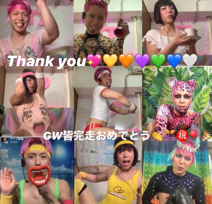 コスチューム(カラフルおじさん時々団地妻クミコ)楽しんでいただけましたか?タペストリーは少しでも外出気分を出すためにアマゾンで急遽購入しました。外出できないGWなんて!ですよね。すべては4.8畳の部屋からできあがっていますが、心は常に宇宙規模。無限です!