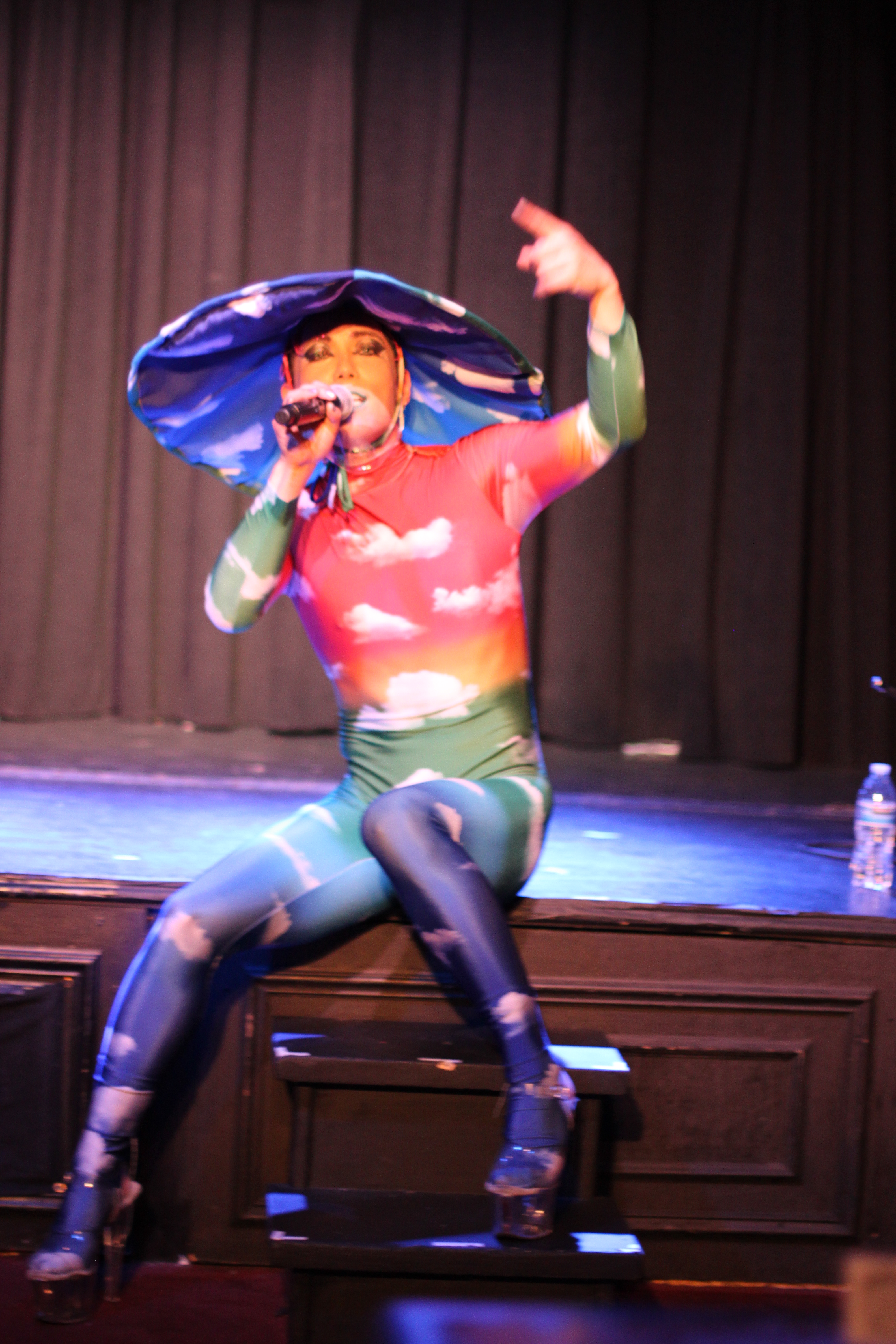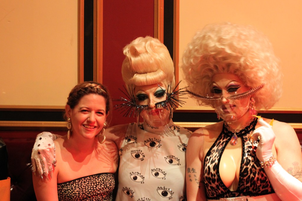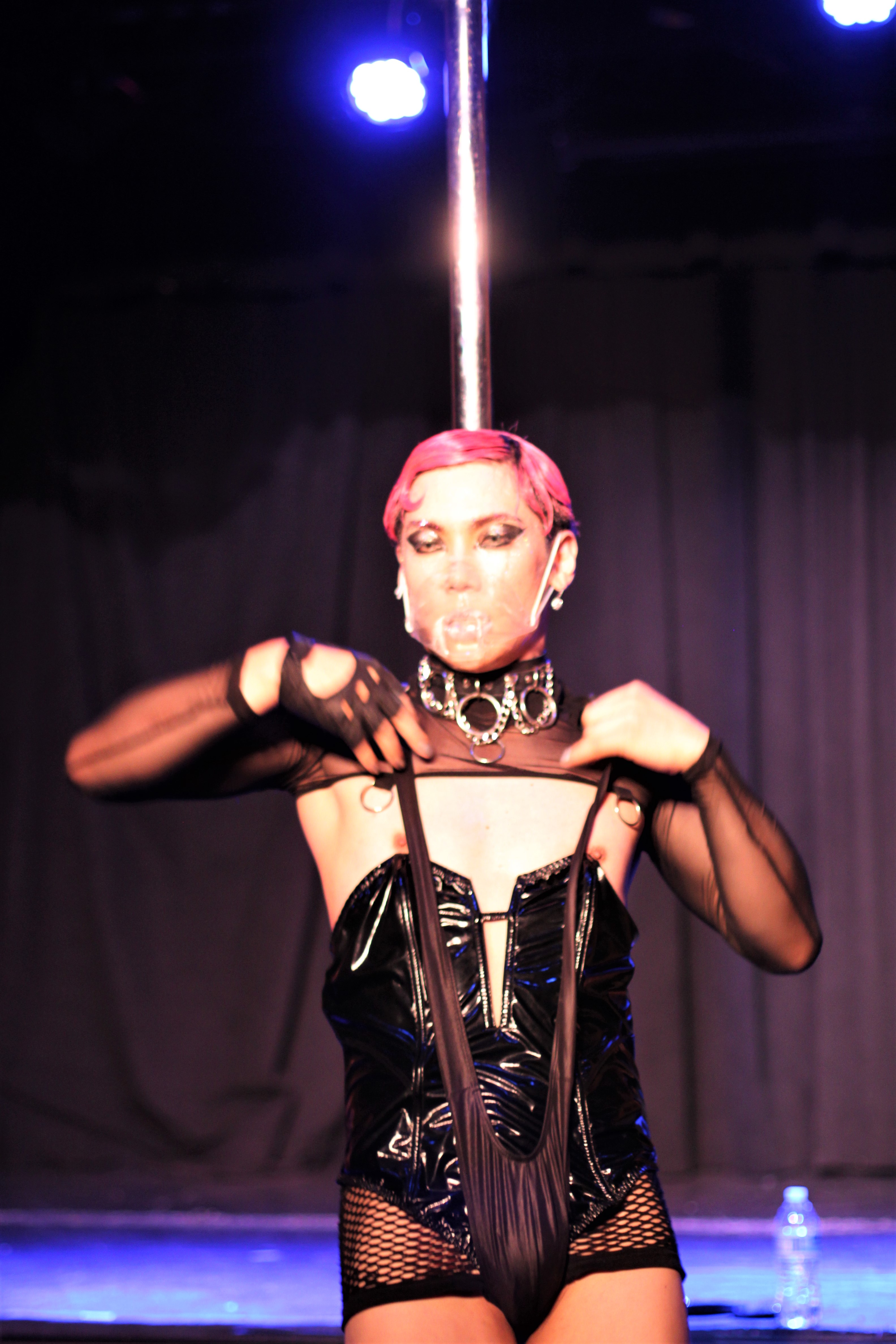 そして、会場の後ろから白のレオタードに羽のついたローブをまとい、頭にはキラキラと光に反射するスパイク状の帽子をかぶりIG登場。その姿はレイディーガガを彷彿させます。ちなみに、IGはレイディーガガと共演したこともあるそう!ローブを脱ぎ捨て早速セクシーかつ迫力のあるポールダンスが始まりました。最初のポールダンスが終わり、会場のお客さん達に英語と日本語で挨拶。そうこうしているうちに今度は観客も交えてのセクササイズです。観客の人たちも皆立ち上がり一緒にセクササイズ!観客の中には後ほどゲスト出演していたお姉さん達も(写真下)。マスクもお洒落です。