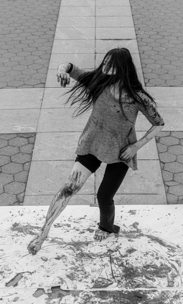 ペインティングのパフォーマー、ピノキオさんとコラボしたのをきっかけに作り上げたスタイルです。ロンドンから観光でニューヨークに来た方が私のダンスを見て気に入ってくれたようで、帰国後に「あの日のあの紙があったら買いたい」と連絡をくれました。NYでの思い出の品として大切にしてくれていると思うと嬉しいです。