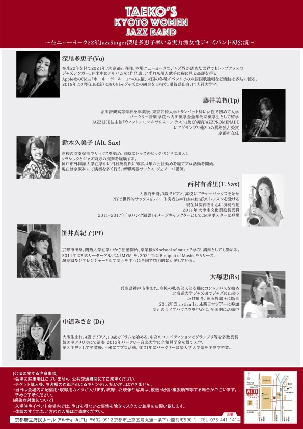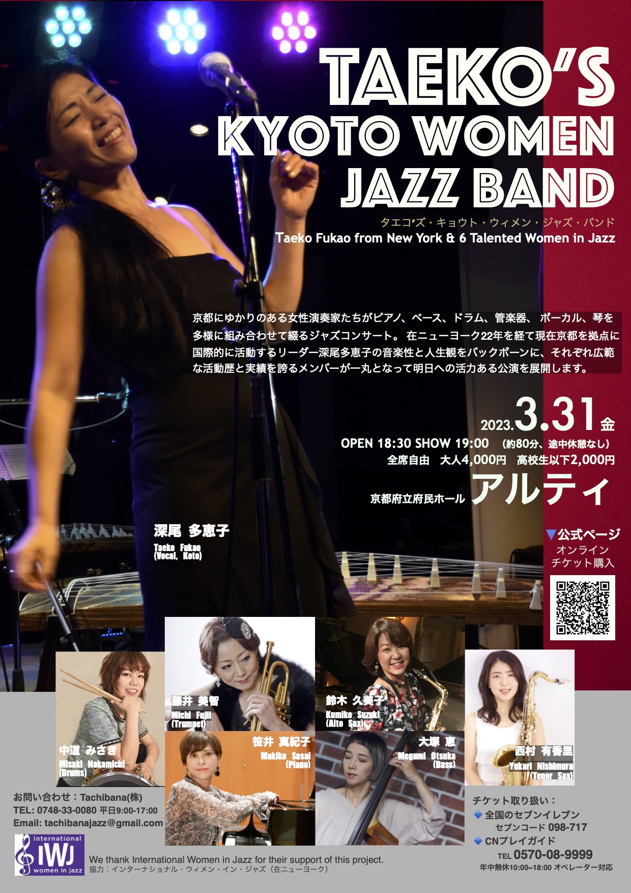 2023年3月31日は京都でライブイベント【TAEKO’s Kyoto Women Jazz Band】を開催予定です。6人の女性ミュージシャンと一緒に開催します。3月はちょうどウィメンズマンスなんですよね。