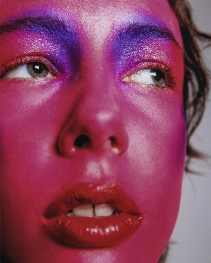 HINAKOの描くメイクは、美しさを引き立てることももちろんあるが、基本はアート。メイクにも普通では使わない色でデザインが施されていたり、カラフルな模様がモデルの顔面を覆っていたりする。モデルの顔が彼女にとってのキャンバスなのだ。