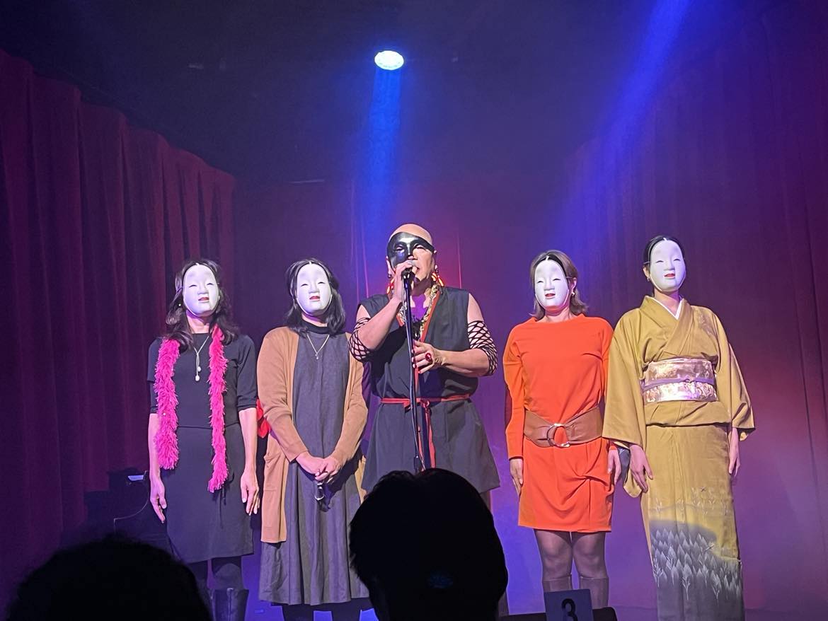 ライブの途中、客席から4人の女性をトシさんが選んでステージに上げた。福の能面みたいなのを被って、二人ずつトシさんの横で即興で踊り始めたのだけ。これがなんとも言えずシュールで、不思議と目が離せない。会場全体が「これ、何?でも最高!」っていう不思議な空気に包まれている。